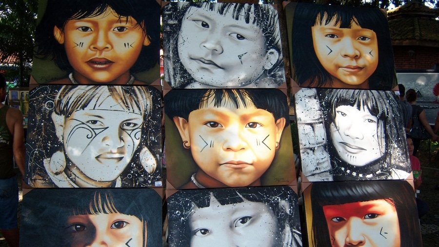A paraense Evna Moura orienta uma oficina que produz composições artísticas a partir de fotografias, carimbos que representam figuras ou elementos da natureza e tintas naturais.
