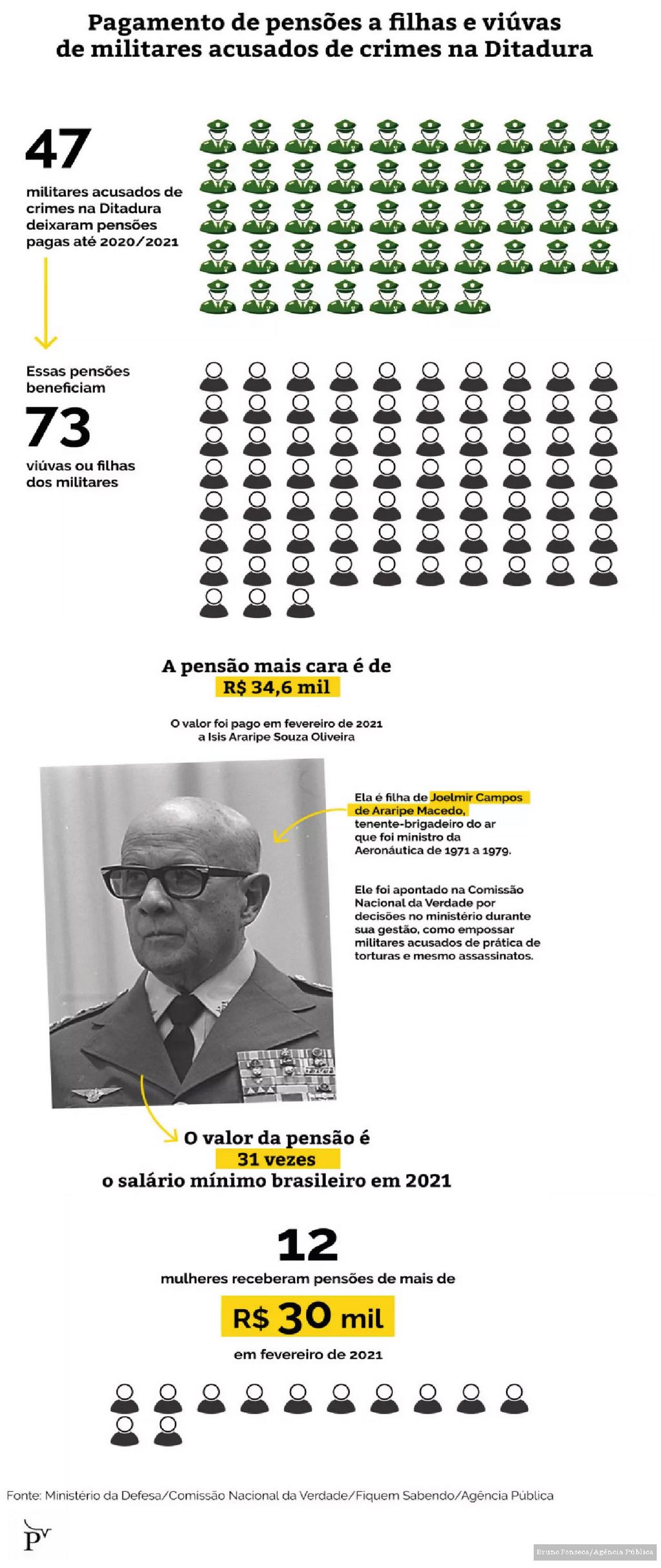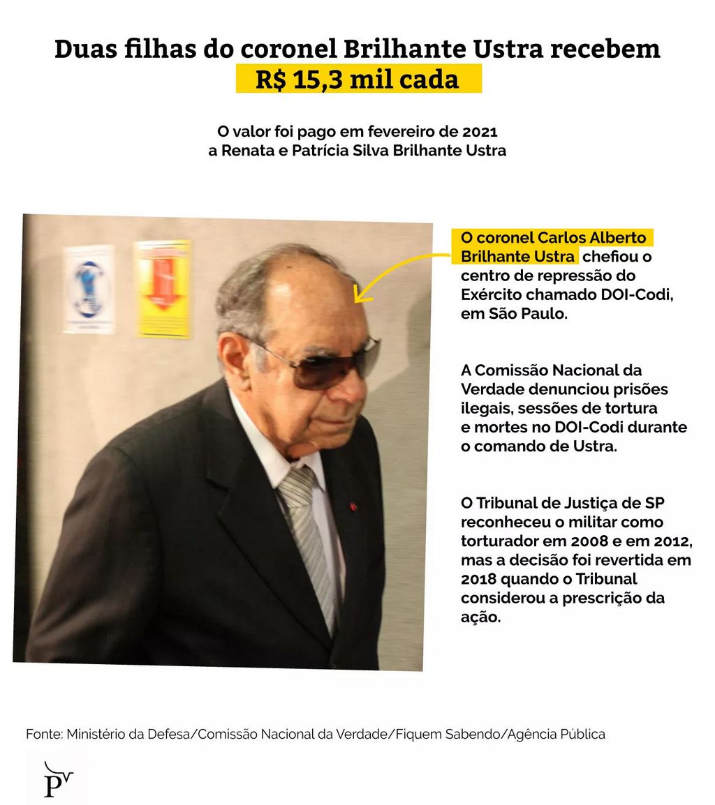 E mais: incluindo o pagamento às duas filhas do ex-coronel, o benefício é concedido ao todo a 73 mulheres, viúvas ou filhas de 47 falecidos que foram acusados de crimes na ditadura pela Comissão Nacional da Verdade (CNV). Somente em fevereiro de 2021, o governo brasileiro pagou R$ 1.264.131,79 ao grupo de herdeiras desses militares, considerando os valores de remuneração básica bruta. Há ainda outros dois casos de pensões que não constam na base de fevereiro, mas estão presentes em outros meses: uma paga até janeiro de 2021, no valor de R$ 30.508,03; e outra paga até julho de 2020, no valor de R$ 31.146,60.