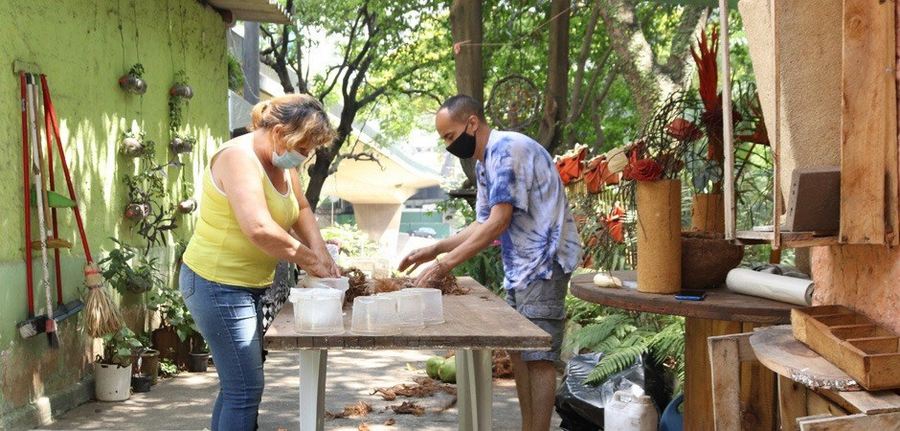 O vaso é produzido pela iniciativa “Artesanato Sustentável com o Bagaço da Cana e do Coco”. As etapas para a produção consistem na triagem, trituração do coco e da cana, manuseio, criação, modelagem, confecção, acabamento das peças ornamentais e compostagem.